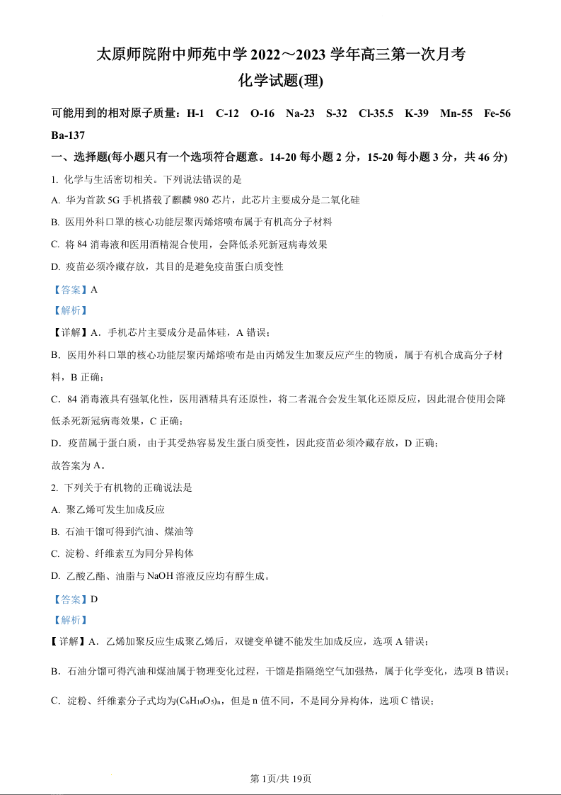 高三化学(解析版)--山西省太原师范学院附属中学23届高三上学期第一次月考
