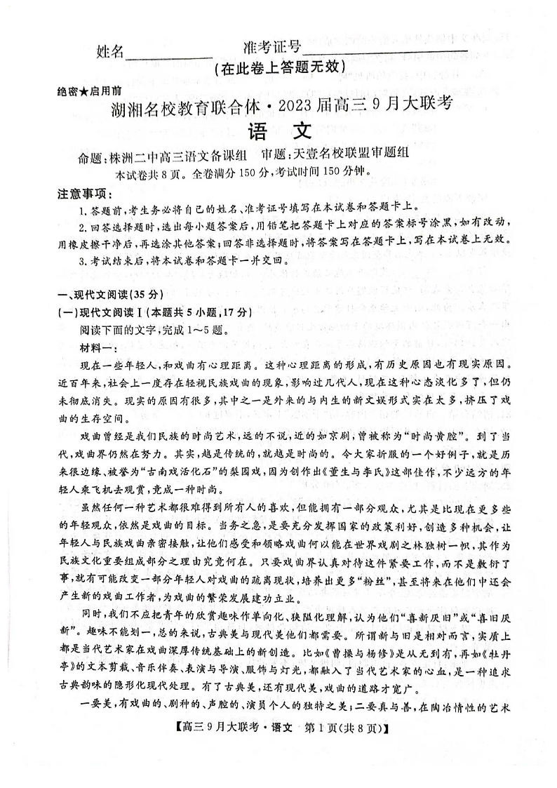 高三语文--湖湘名校教育联合体2023高三9月大联考