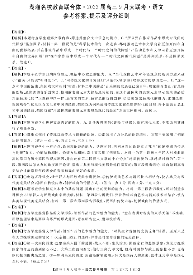 高三语文答案--湖湘名校教育联合体2023高三9月大联考