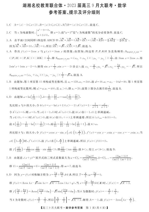 高三数学答案--湖湘名校教育联合体2023高三9月大联考