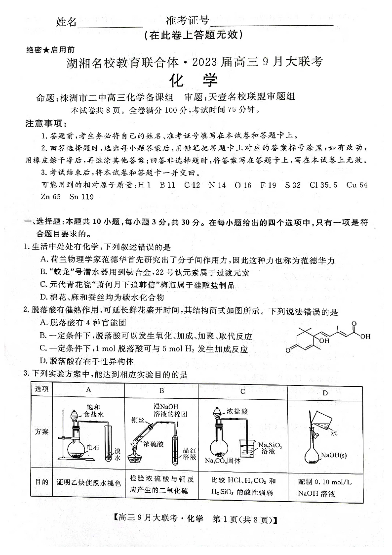 高三化学--湖湘名校教育联合体2023高三9月大联考