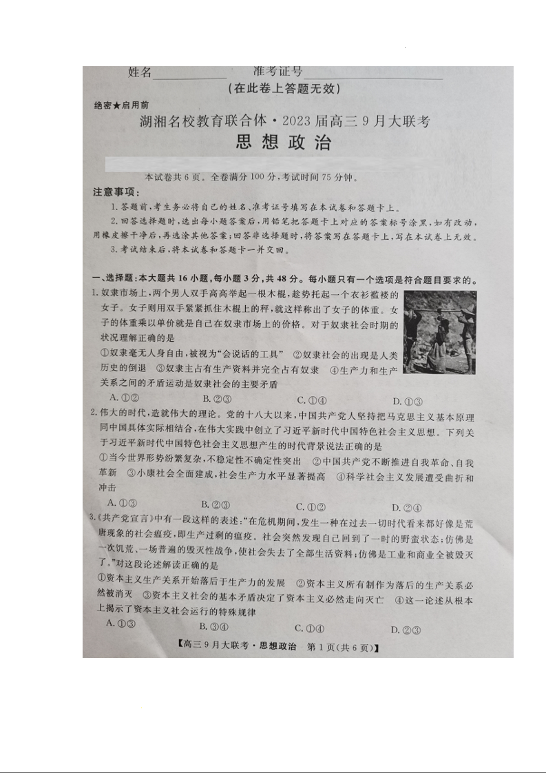 高三政治--湖湘名校教育联合体2023高三9月大联考