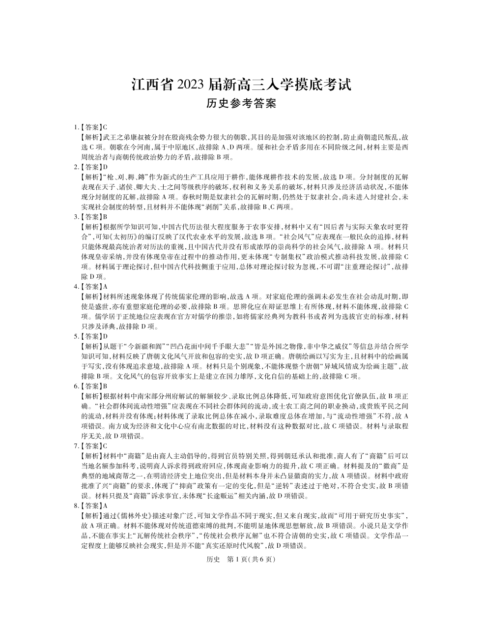 高三历史答案--江西省智慧上进2023新高三上学期入学摸底考试