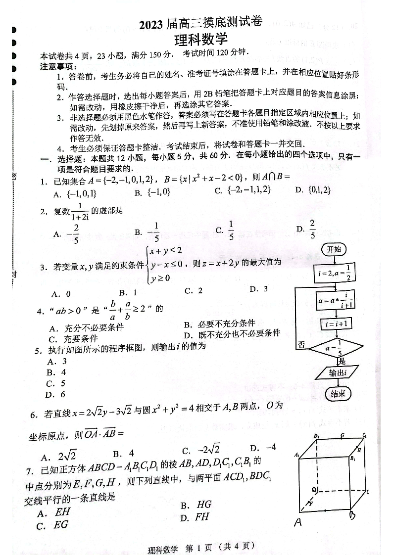 高三理数+答案--江西省南昌市2023届高三摸底测试(零模)