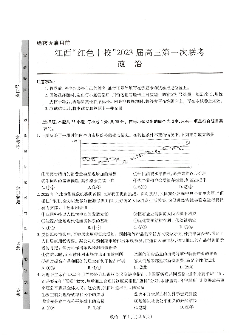高三政治--江西省“红色十校”2023届高三上学期第一次联考