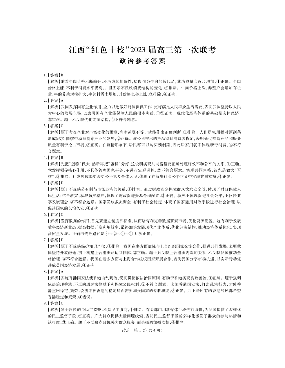 高三政治答案--江西省“红色十校”2023届高三上学期第一次联考