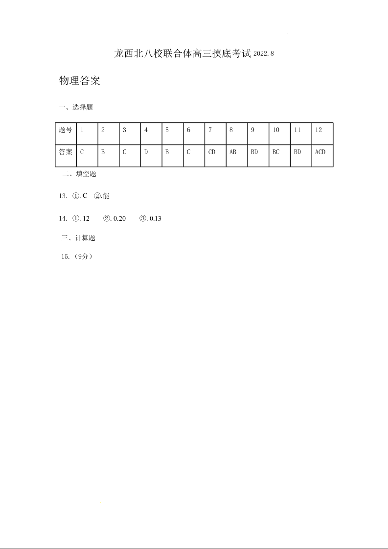 高三物理答案--黑龙江省龙西北八校联合体2023高三上学期开学考