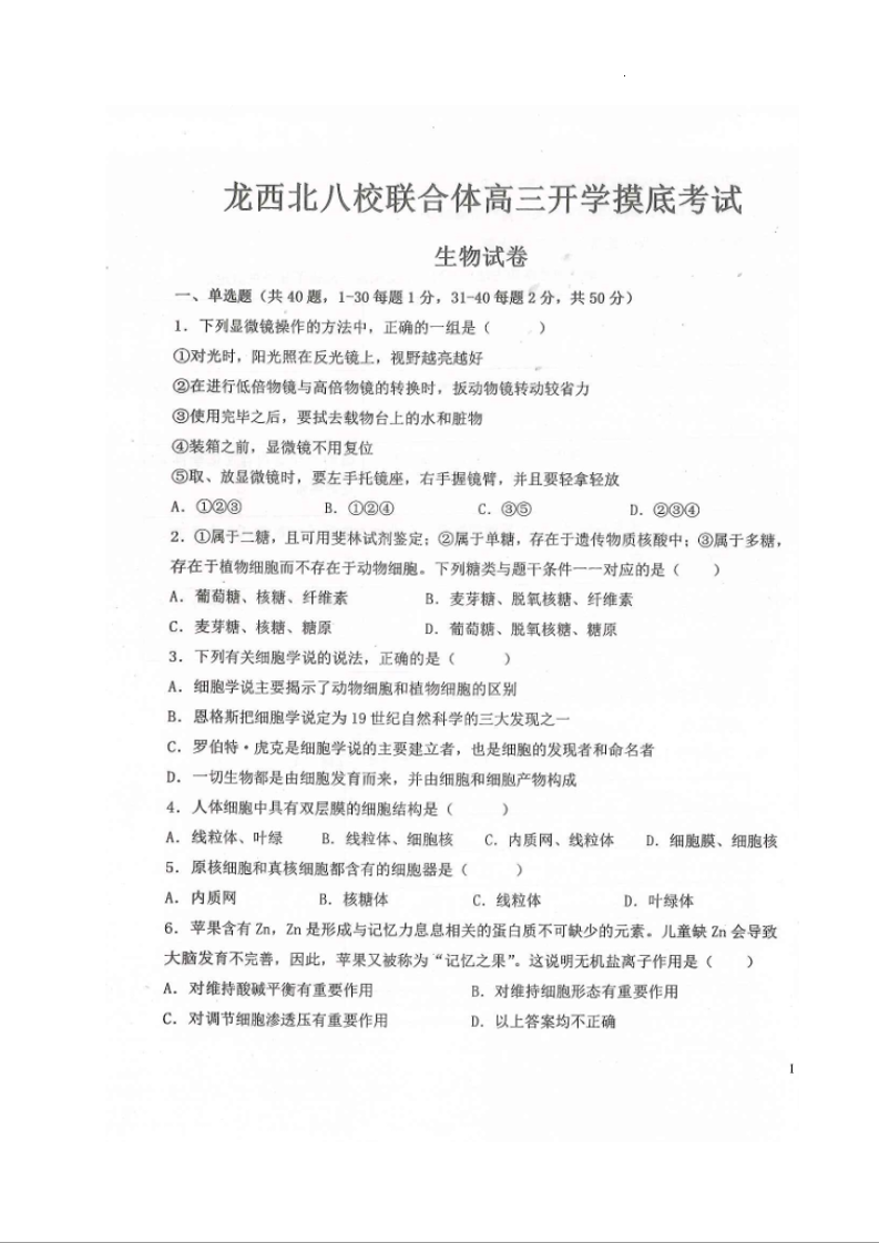 高三生物--黑龙江省龙西北八校联合体2023高三上学期开学考