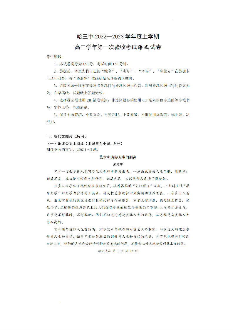 高三语文+答案--黑龙江省哈尔滨市第三中学校2022-2023学年高三上学期第一次验收考试