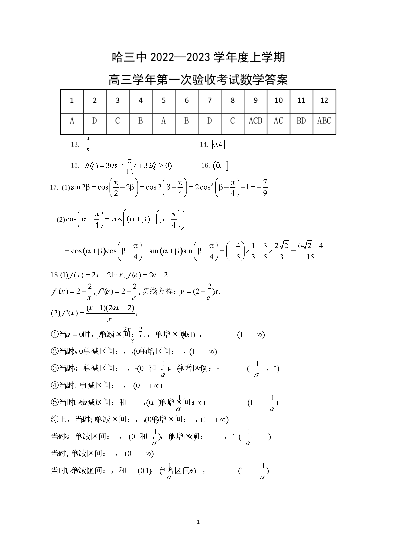 高三数学答案--黑龙江省哈尔滨市第三中学校2022-2023学年高三上学期第一次验收考试