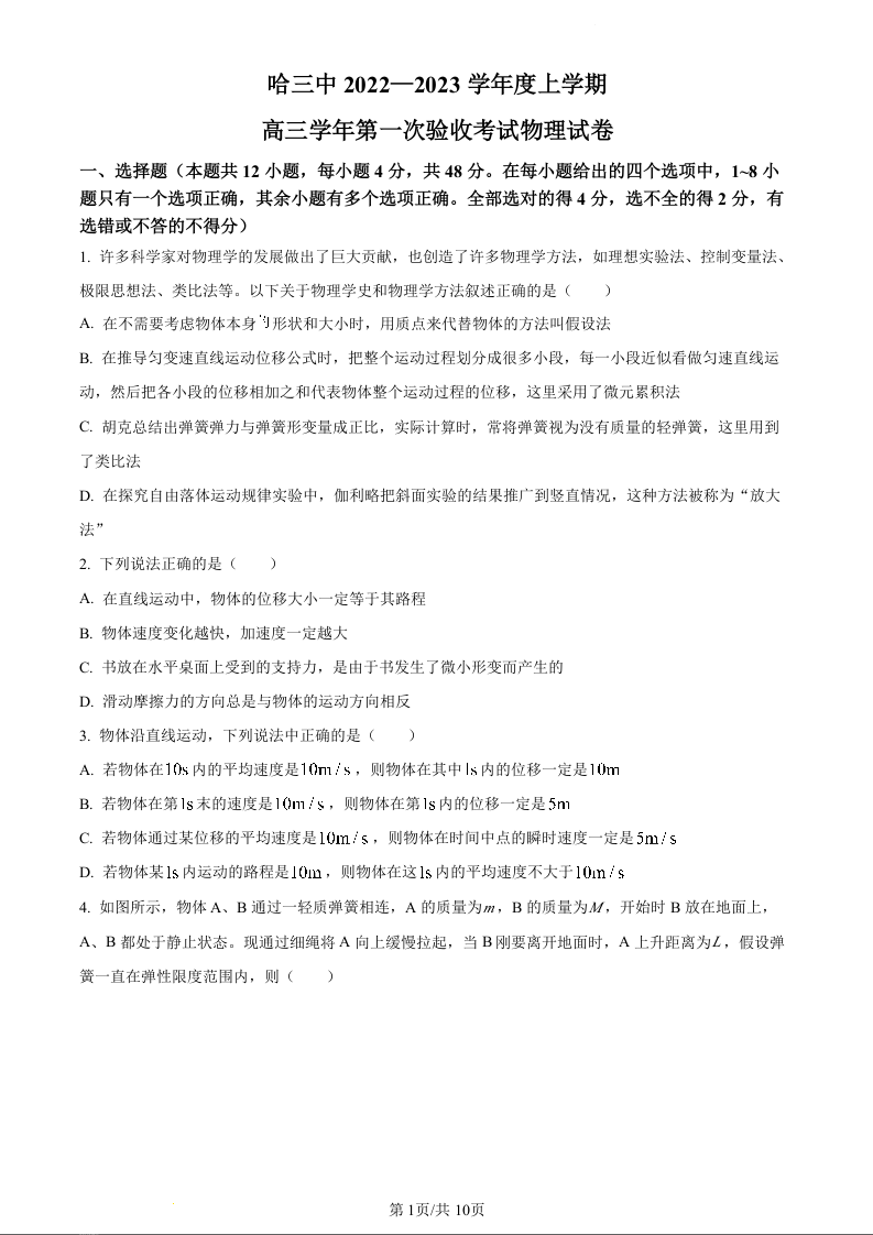 高三物理+答案--黑龙江省哈尔滨市第三中学校2022-2023学年高三上学期第一次验收考试