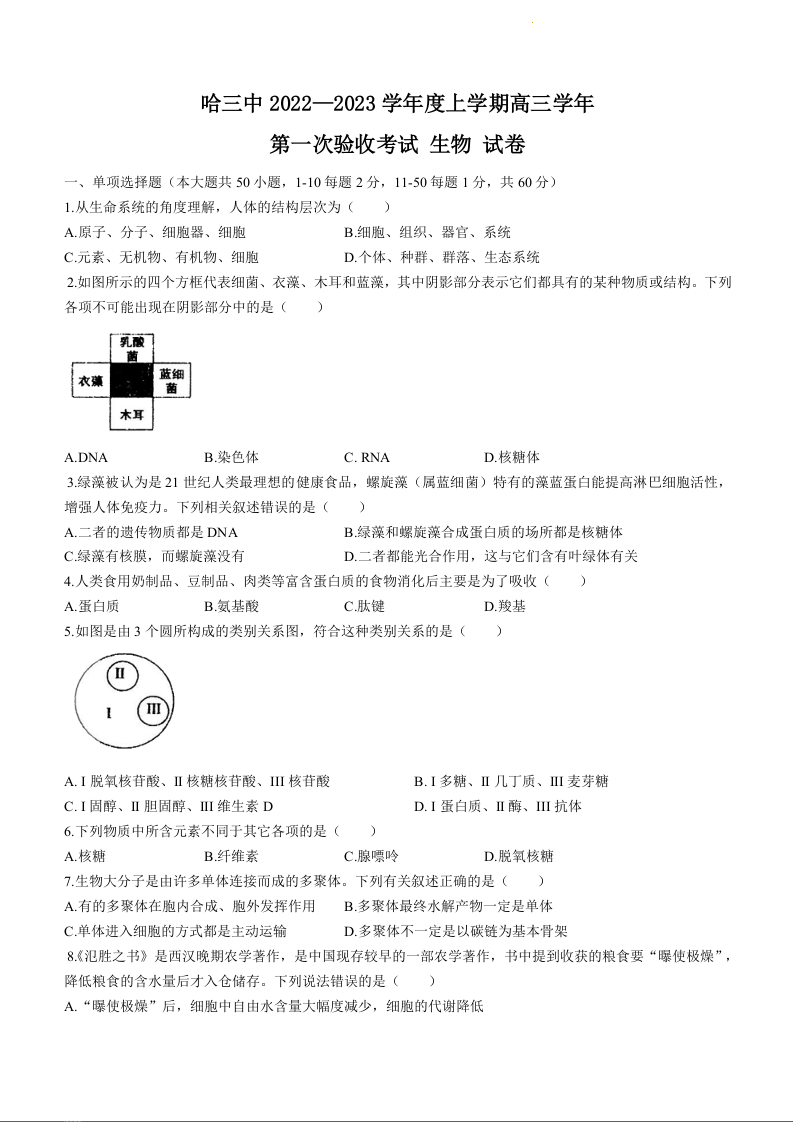 高三生物+答案--黑龙江省哈尔滨市第三中学校2022-2023学年高三上学期第一次验收考试