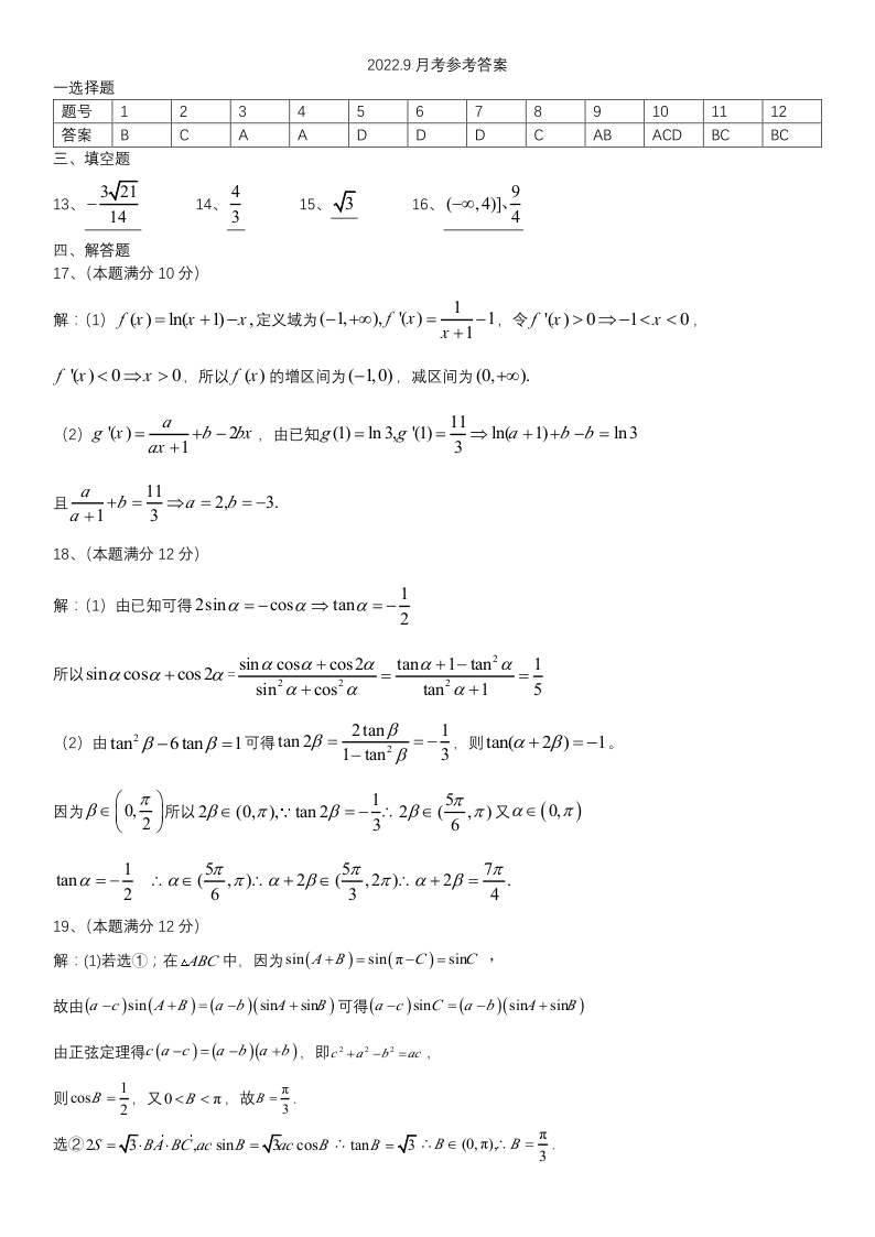 高三数学答案--黑龙江省哈尔滨师范大学附属中学2023高三9月月考