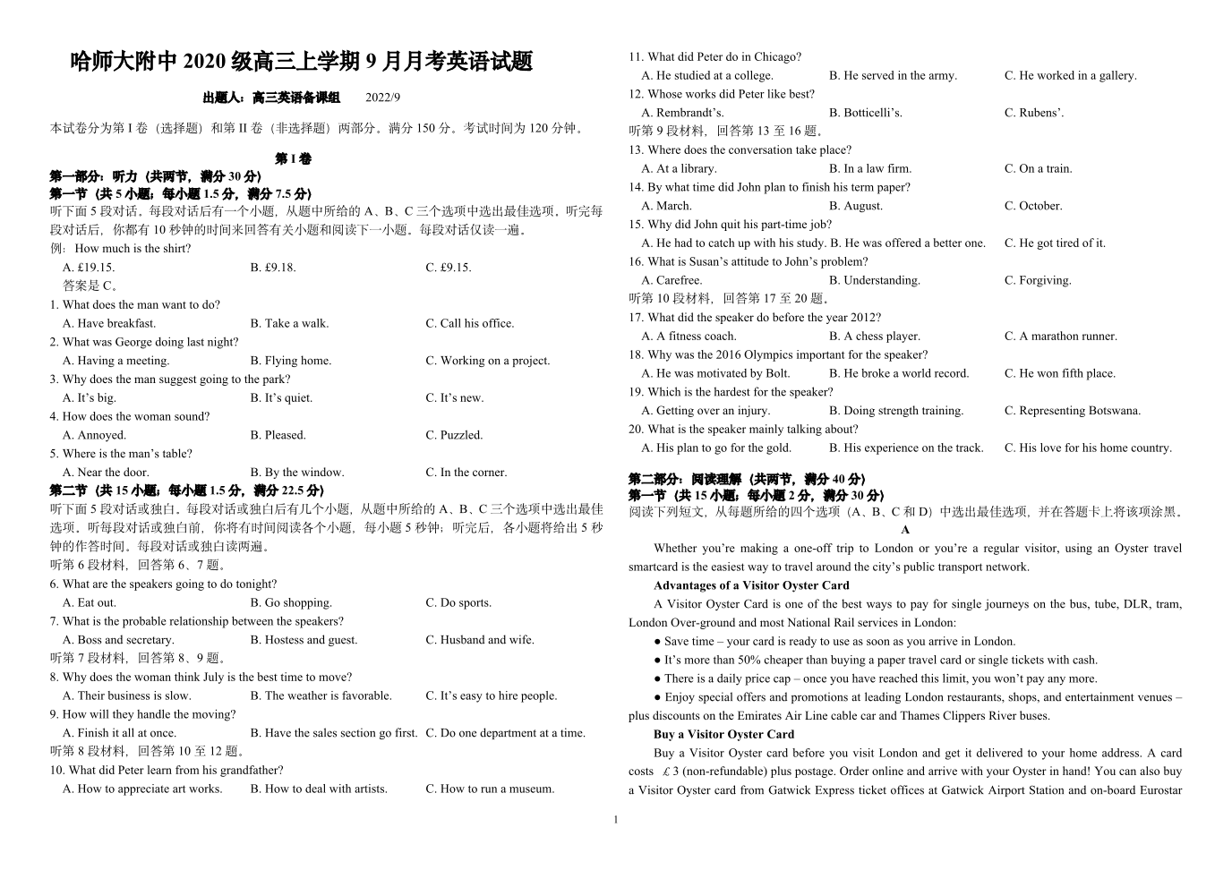 高三英语--黑龙江省哈尔滨师范大学附属中学2023高三9月月考