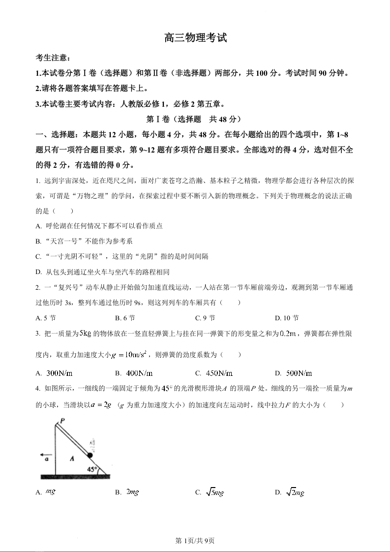 高三物理+答案--河南省豫南名校2023高三上学期9月质量检测