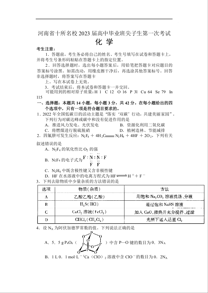 高三化学--河南省十所名校高中毕业班尖子生2023届上学期第一次考试