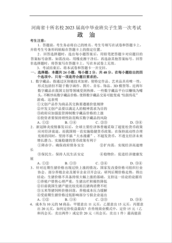高三政治--河南省十所名校高中毕业班尖子生2023届上学期第一次考试