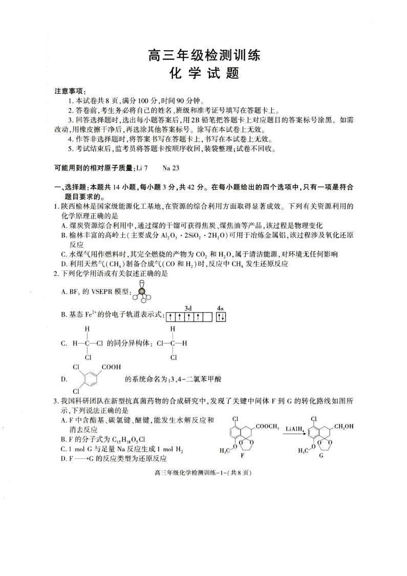 高三化学--陕西省榆林市2026届高三年级检测训练(榆林二模)