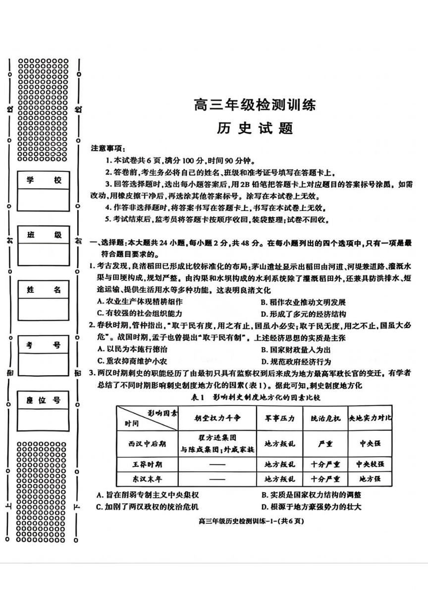 高三历史--陕西省榆林市2026届高三年级检测训练(榆林二模)