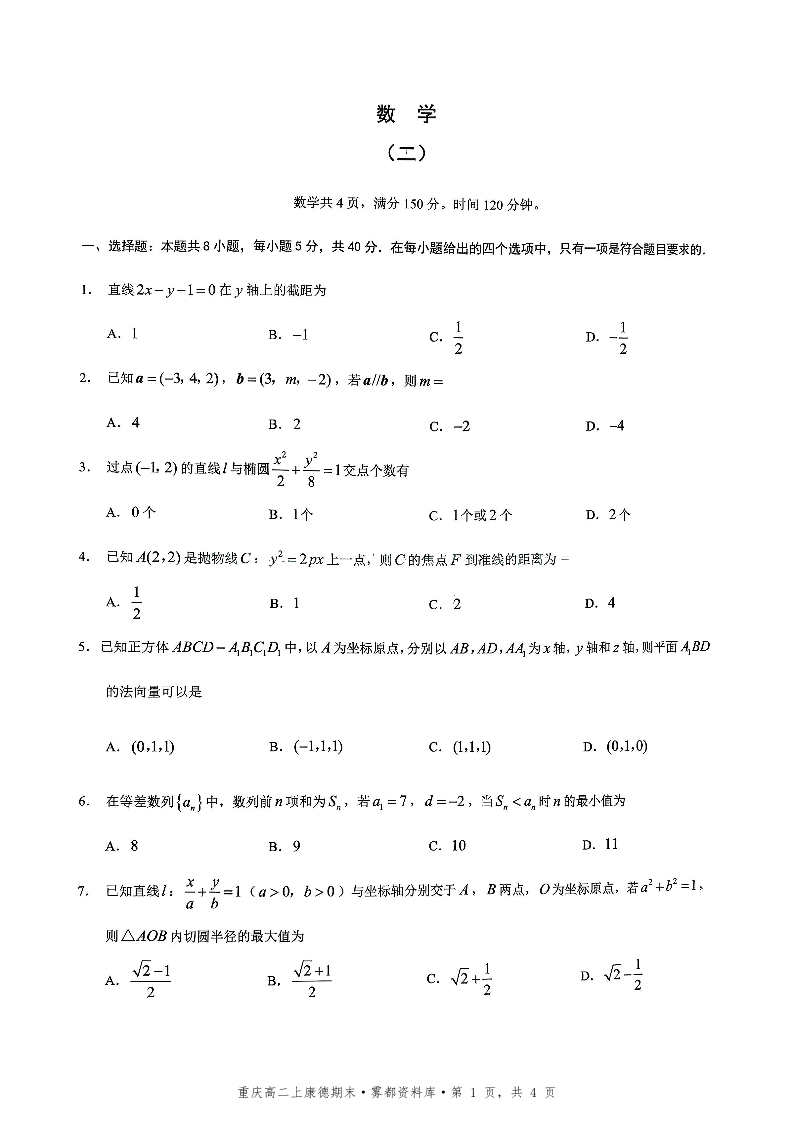 高二数学--重庆市2025-2026学年高二上康德1月期末考试