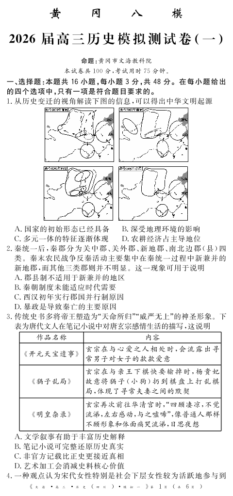 高三历史+答案--四川省黄冈八模2026届高三模拟测试卷(一)