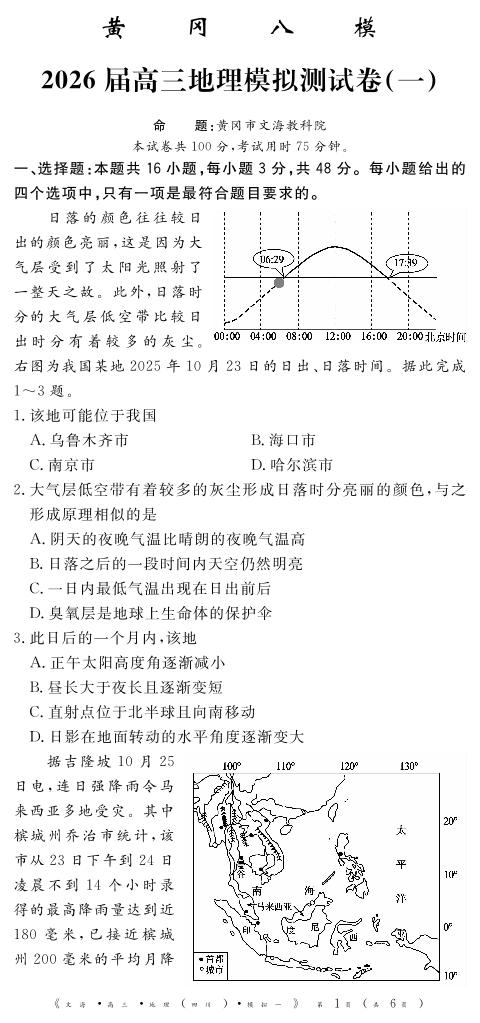 高三地理+答案--四川省黄冈八模2026届高三模拟测试卷(一)
