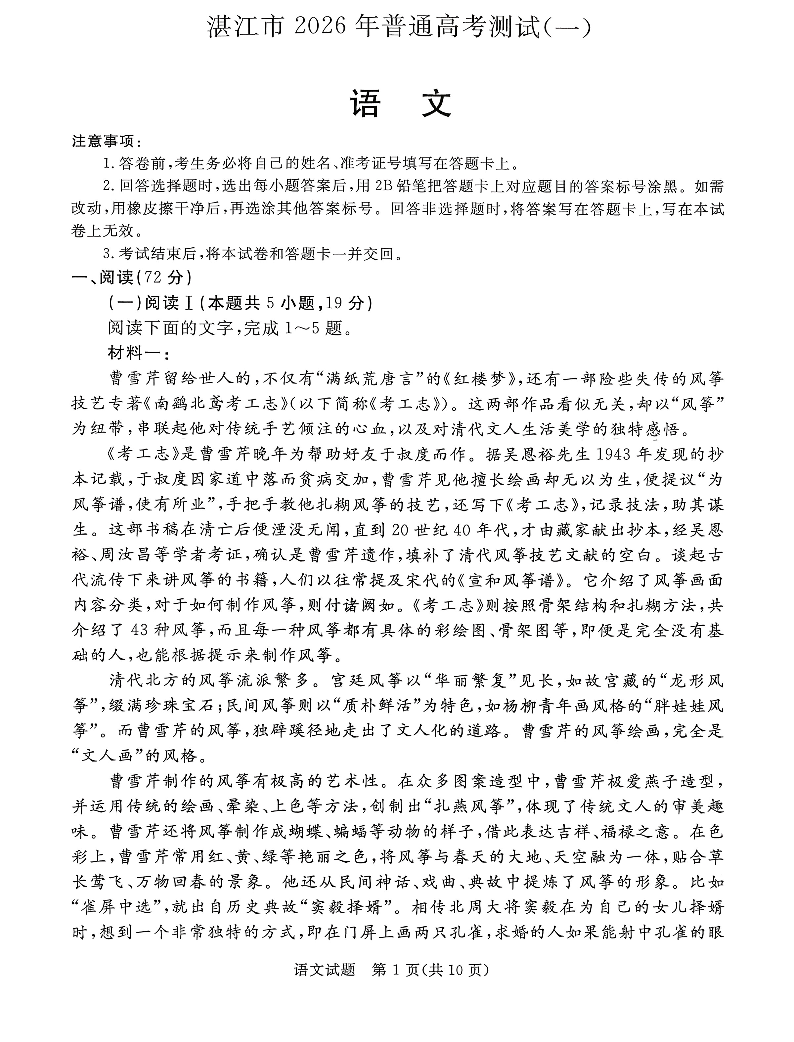 高三语文--广东省湛江市高三年级2026年高考测试(一)(湛江一模)