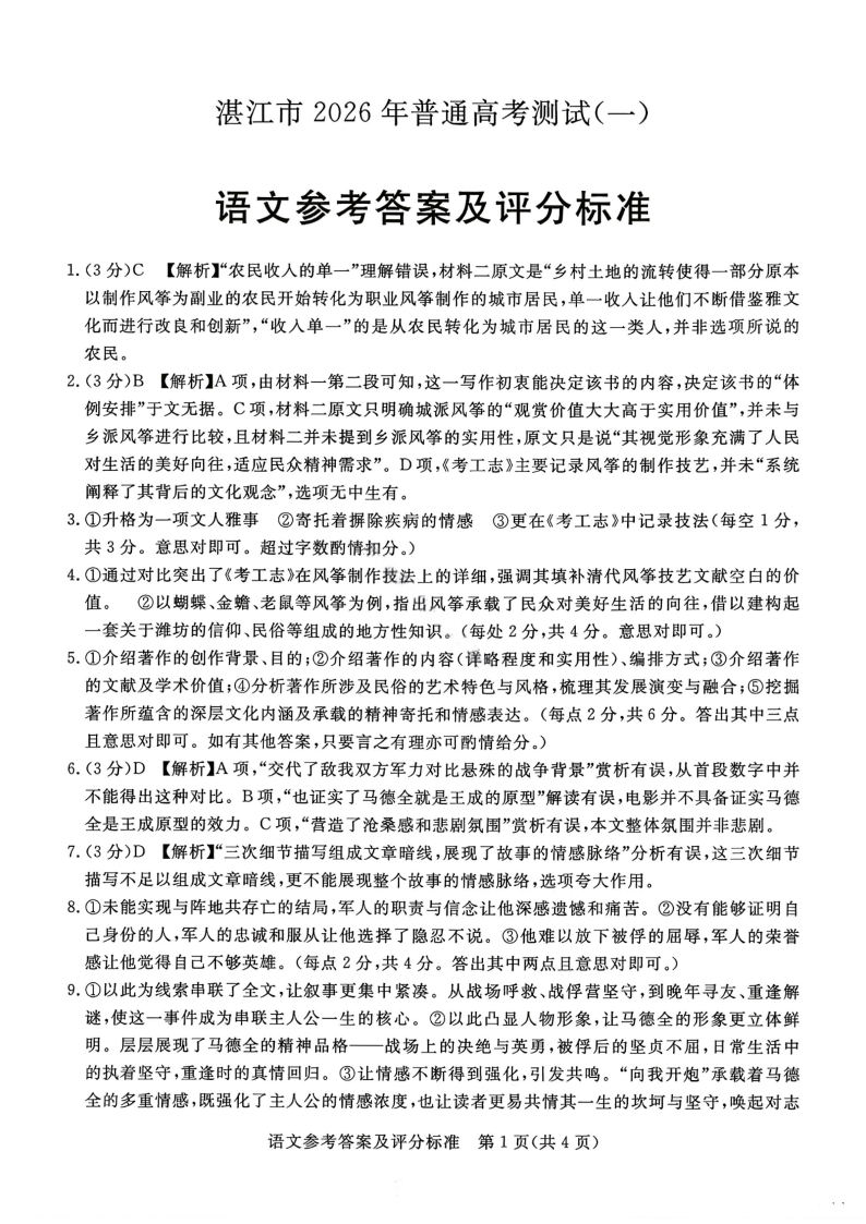 高三语文答案--广东省湛江市高三年级2026年高考测试(一)(湛江一模)