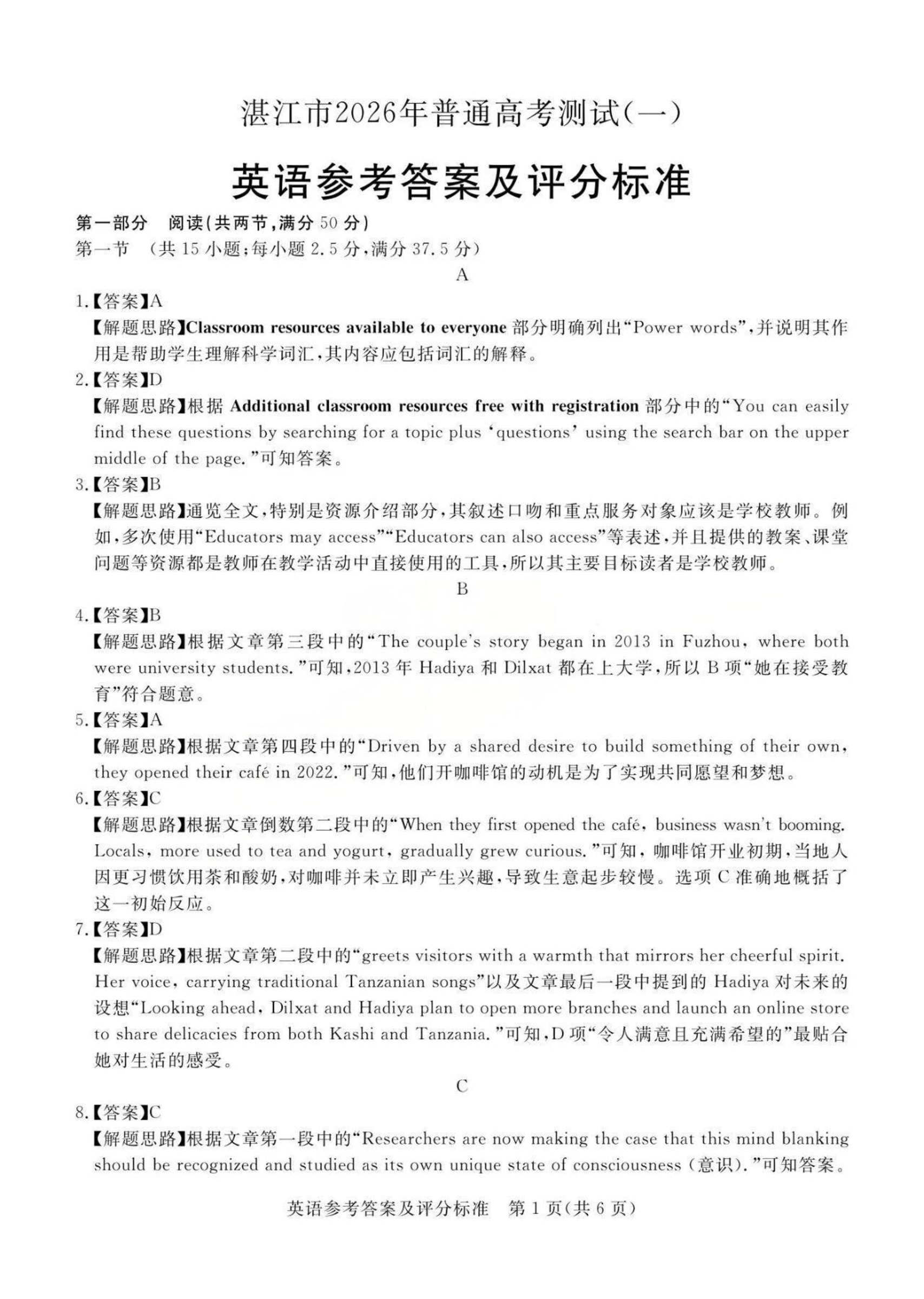 高三英语答案--广东省湛江市高三年级2026年高考测试(一)(湛江一模)
