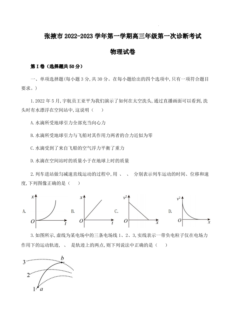 高三物理+答案--甘肃省张掖市23届高三上学期第一次诊断考试