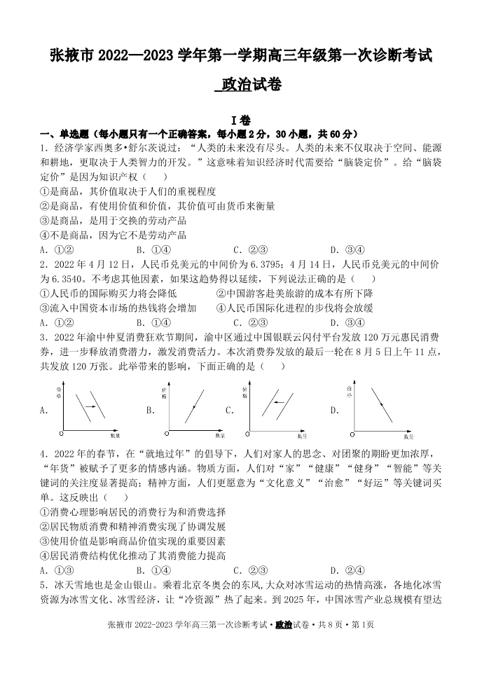高三政治--甘肃省张掖市23届高三上学期第一次诊断考试