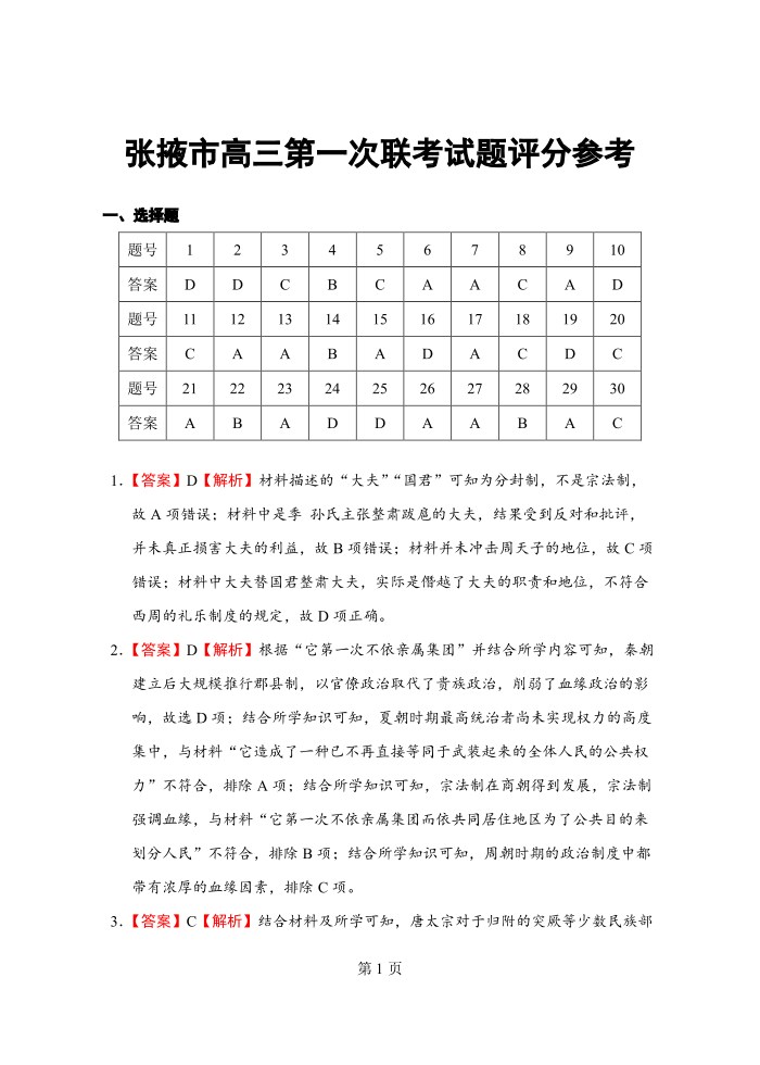 高三历史答案--甘肃省张掖市23届高三上学期第一次诊断考试