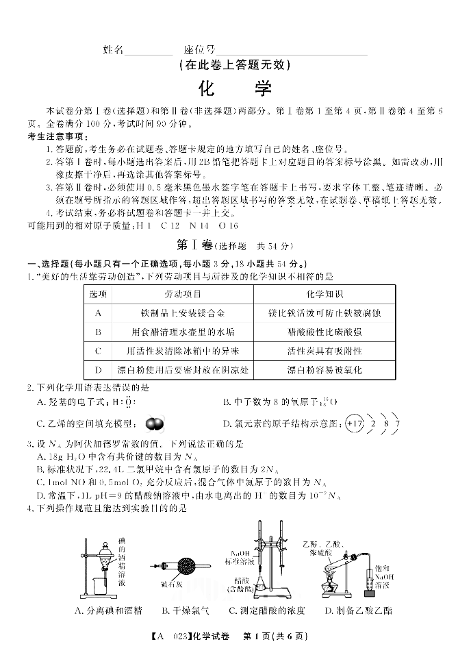 高三化学+答案--安徽省皖江名校联盟2023高三上学期开学考试