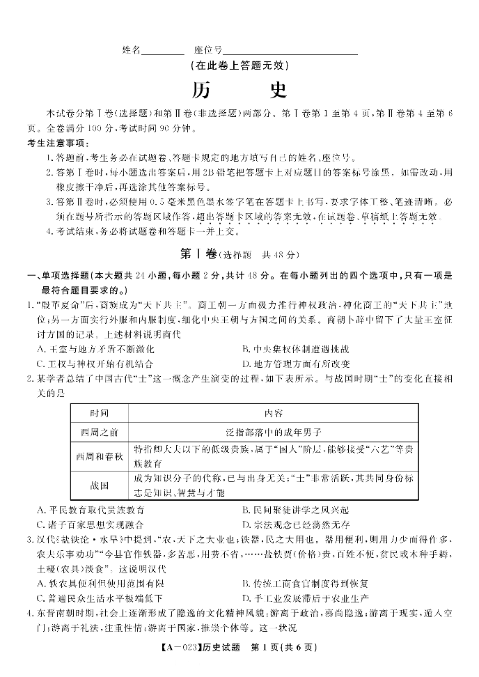 高三历史+答案--安徽省皖江名校联盟2023高三上学期开学考试