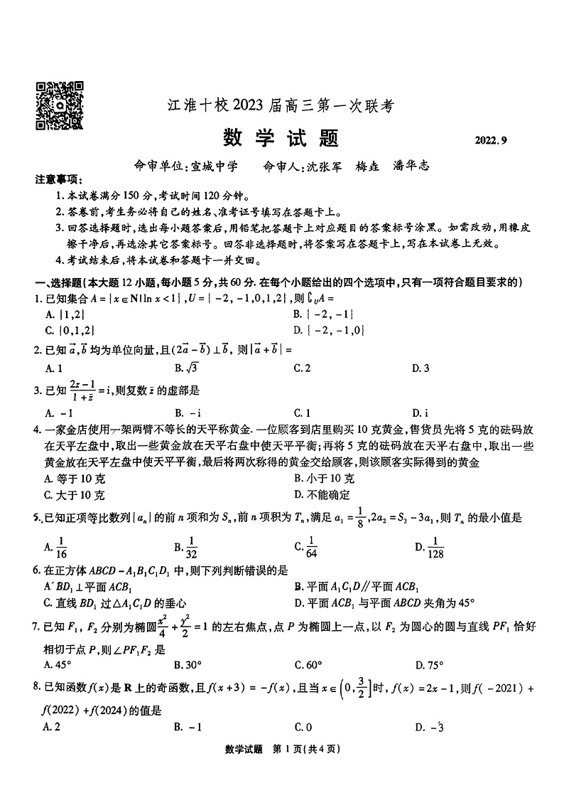 高三数学--安徽省江淮十校2022-2023学年高三上学期第一次联考