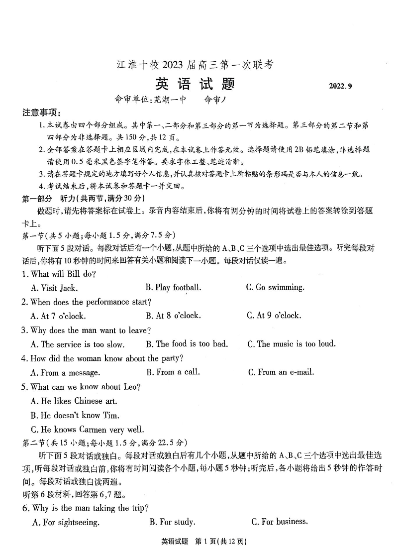 高三英语--安徽省江淮十校2022-2023学年高三上学期第一次联考