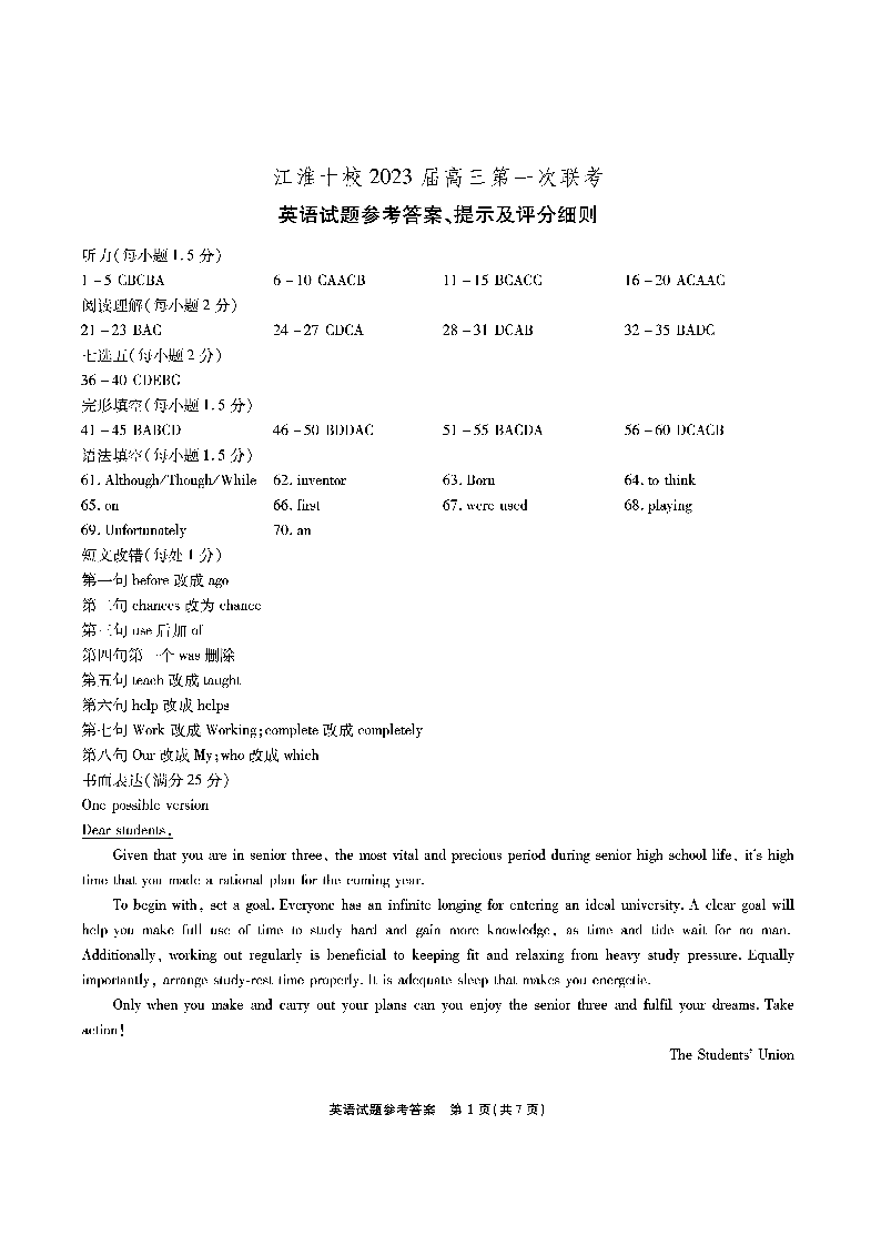 高三英语答案--安徽省江淮十校2022-2023学年高三上学期第一次联考