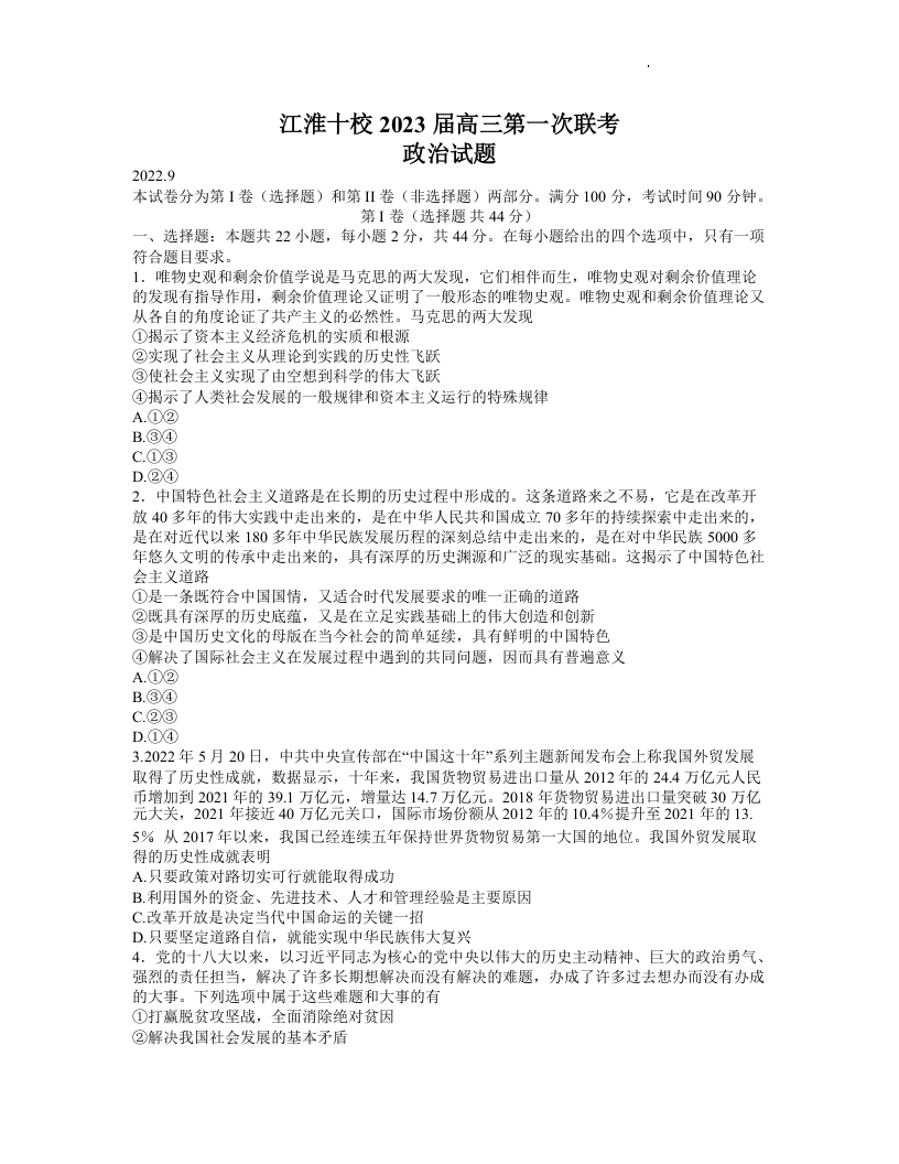 高三政治--安徽省江淮十校2022-2023学年高三上学期第一次联考
