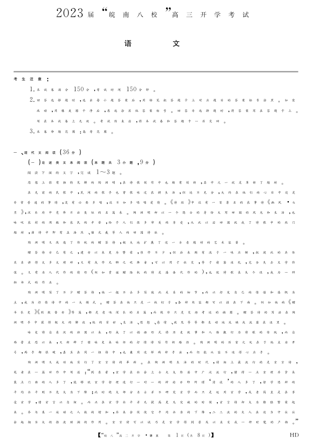 高三语文--安徽省“皖南八校”2023高三开学考试