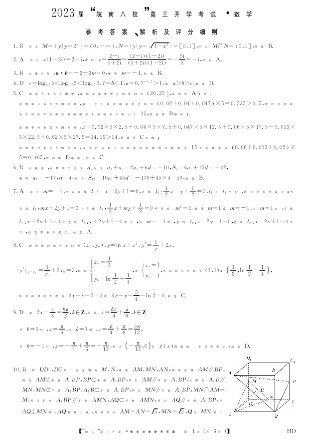 高三数学答案--安徽省“皖南八校”2023高三开学考试