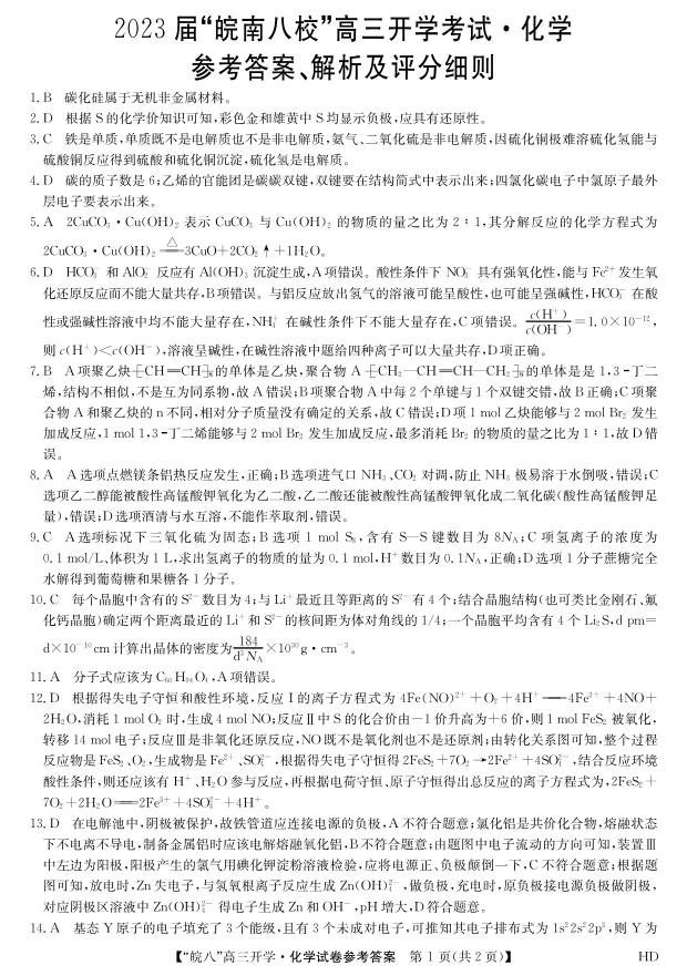 高三化学答案--安徽省“皖南八校”2023高三开学考试