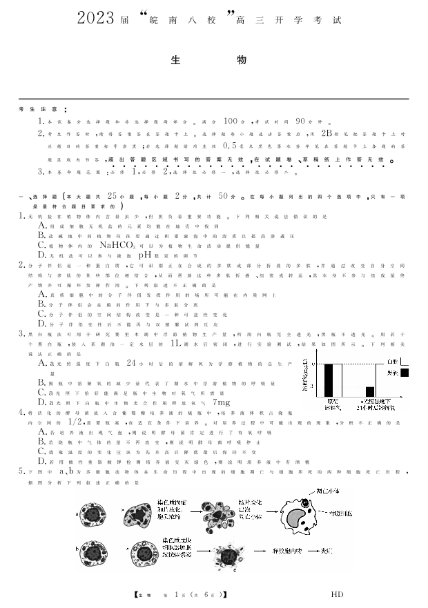 高三生物--安徽省“皖南八校”2023高三开学考试