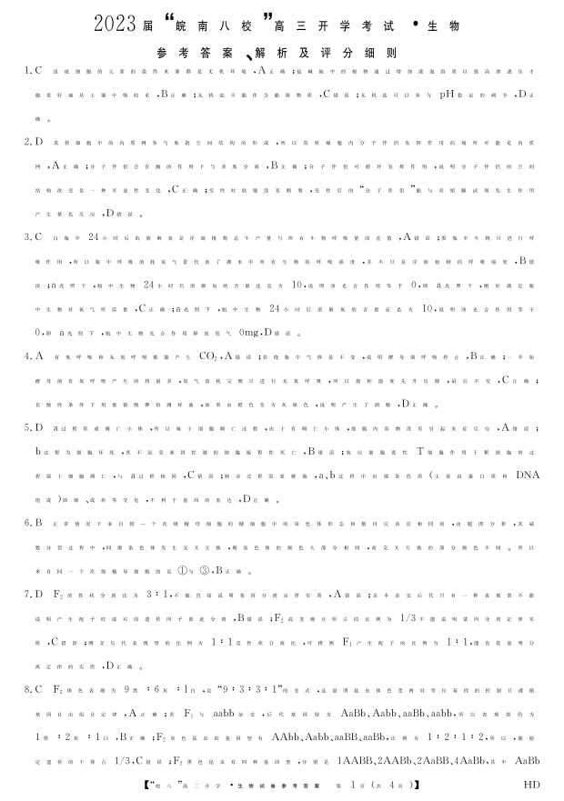 高三生物答案--安徽省“皖南八校”2023高三开学考试