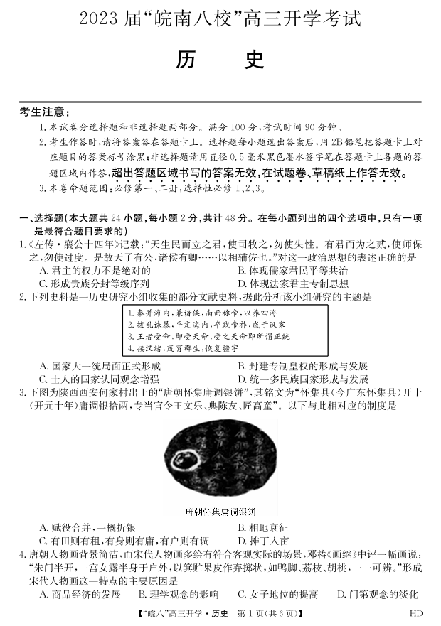 高三历史--安徽省“皖南八校”2023高三开学考试