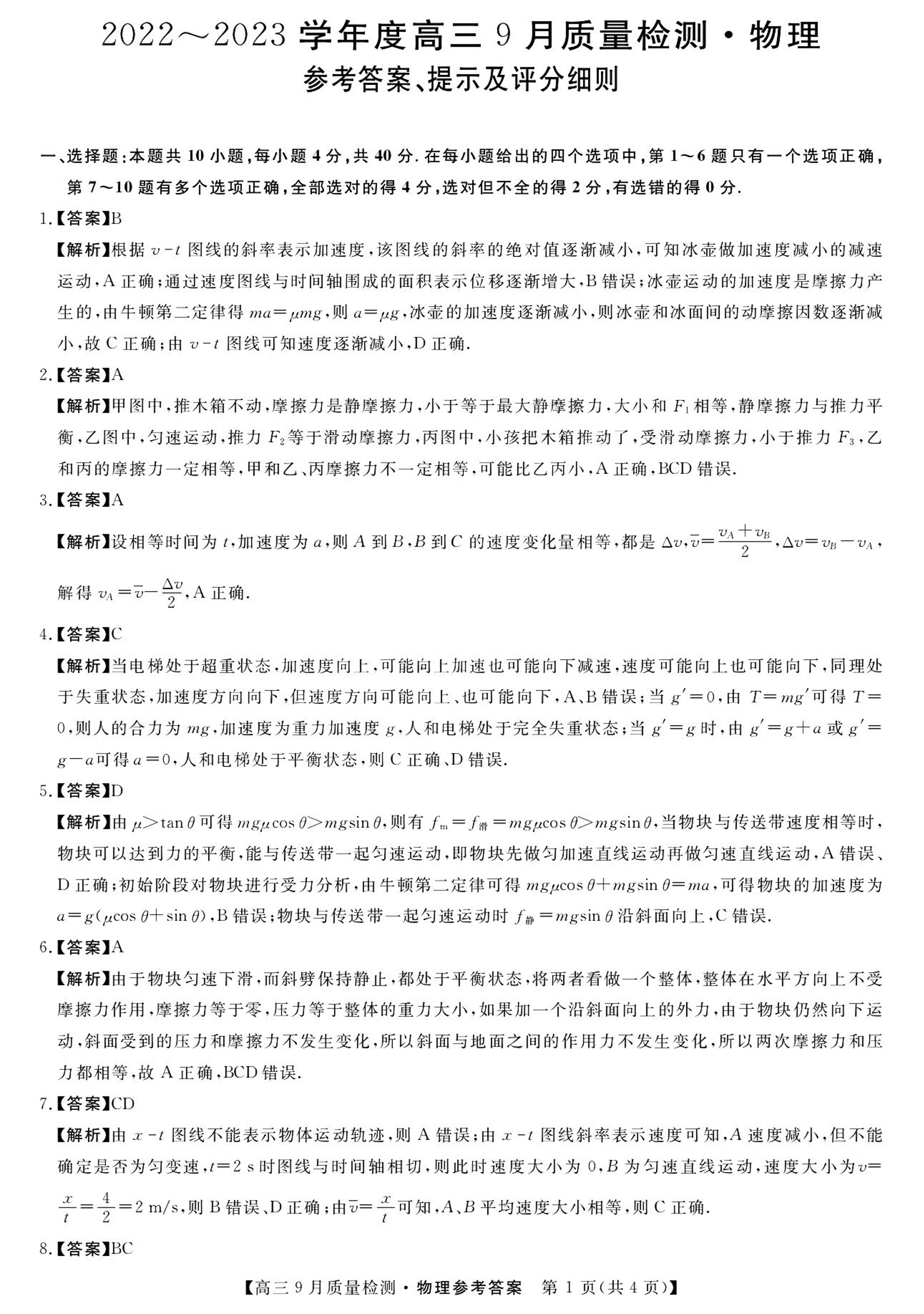高三物理答案--金科大联考2022-2023学年度高三9月质量检测
