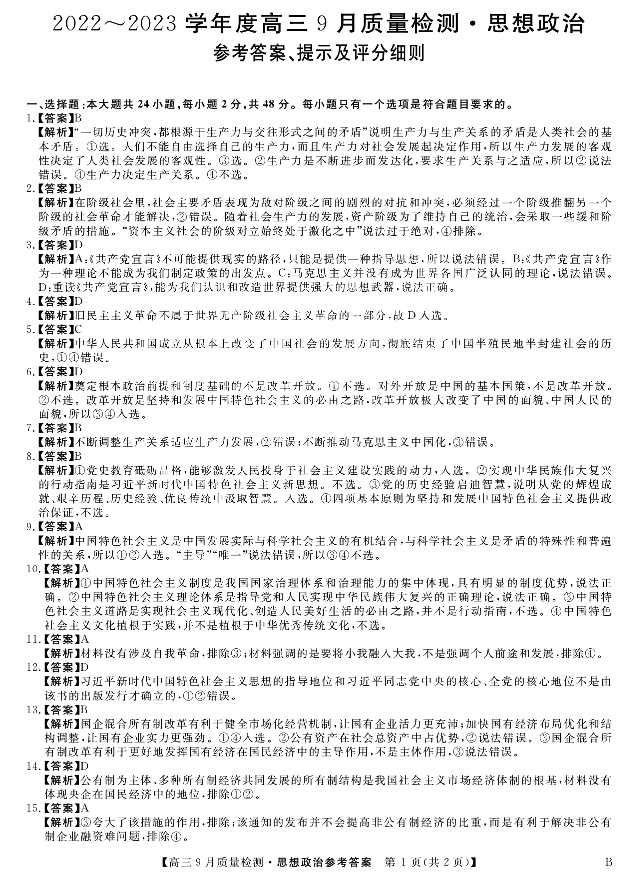 高三政治答案--金科大联考2022-2023学年度高三9月质量检测