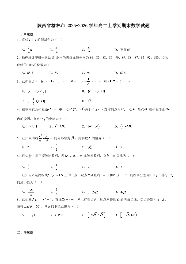 高二数学+答案--陕西省榆林市2025-2026学年高二上学期期末