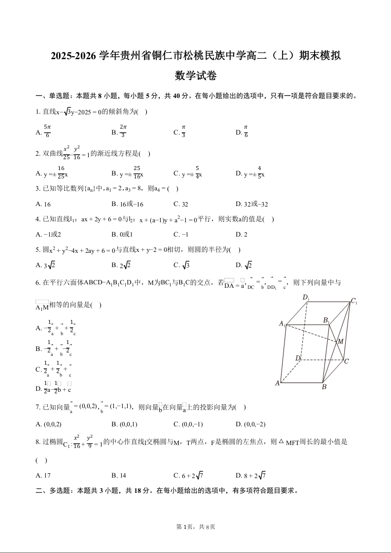 高二数学+答案--贵州省铜仁市松桃民族中学2025-2026学年高二上学期1月期末模拟测试