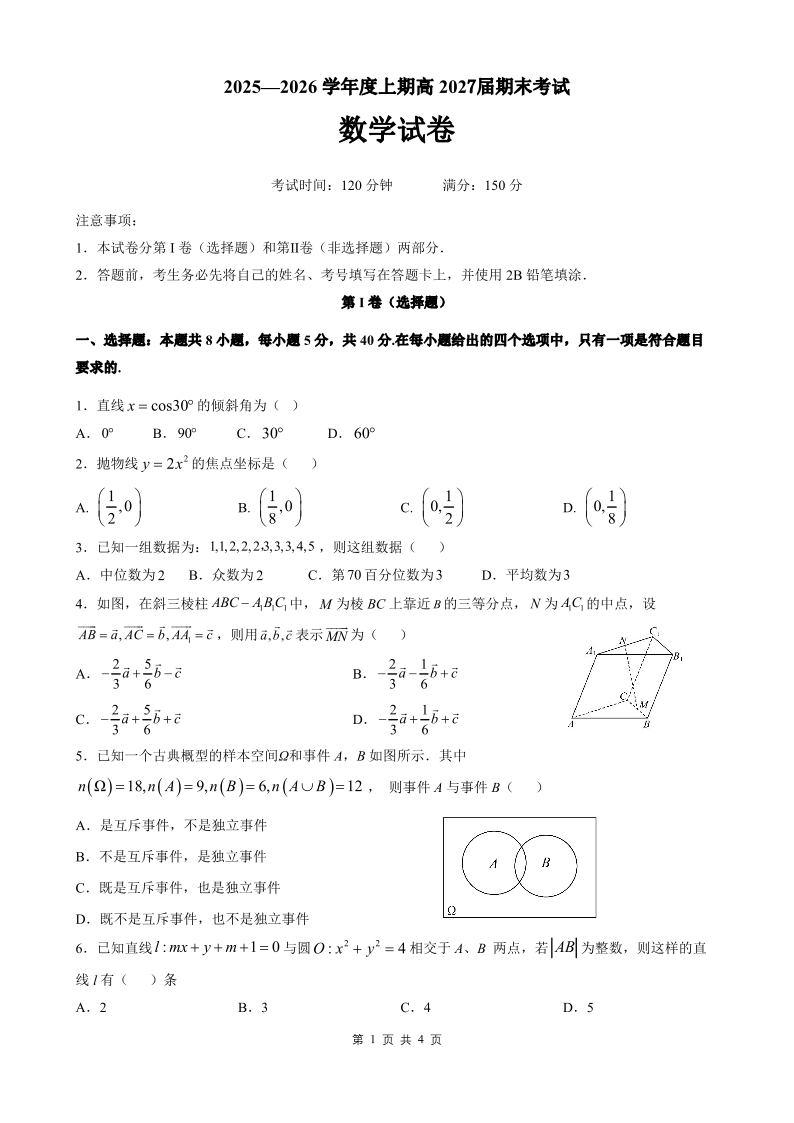 高二数学--四川省成都市第七中学2025一2026学年度上期高二期末考试