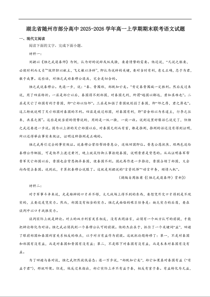 高一语文+答案--湖北省随州市部分高中2025-2026学年高一上学期期末联考